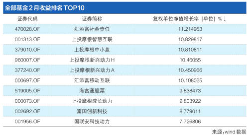 偏股混合型基金2月收益表現亮眼,匯添富社會責任基金以11.21%的收益率排名第一,超過當月普通股票型基金的最高收益率。緊隨其后的是上投摩根的三只產品:上投摩根中小盤、上投摩根新興動力H和上投摩根新興動力A,其收益率分別為10.81%、10.46%和10.45%。